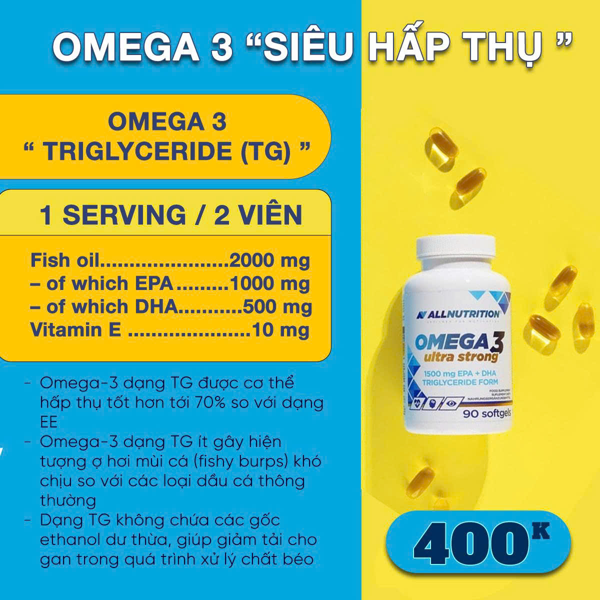 Omega 3 Ultra Strong là dòng sản phẩm dầu cá cao cấp đến từ thương hiệu Allnutrition. Khác với các loại dầu cá thông thường, sản phẩm này sở hữu hàm lượng EPA và DHA cực cao dưới dạng Triglyceride (TG) – dạng tự nhiên giúp cơ thể hấp thụ tối ưu và mang lại hiệu quả vượt trội cho sức khỏe tim mạch, não bộ và thị lực.