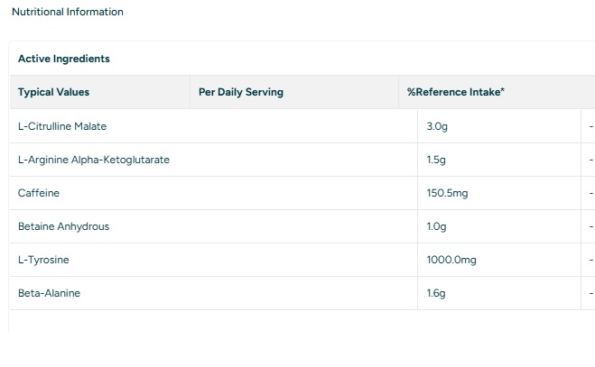 | AAKG (Arginine Alpha-Ketoglutarate) | 1.5g | Tăng sản sinh Nitric Oxide, hỗ trợ sức mạnh cơ bắp. |